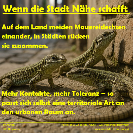 Die Autor:innen erläutern, dass städtische Räume Ressourcen (Sonnenplätze, Spalten, Nahrung) bündeln und gleichzeitig die Bewegung durch Mauern oder Versiegelung eingeschränkt ist. Das erhöht Wiederbegegnungen, senkt Aggressionsanreize und begünstigt soziale Toleranz – selbst bei eigentlich „einsiedlerischen“ Arten. Solche Verhaltensverschiebungen könnten Anpassungen an urbane Lebensräume erleichtert haben.