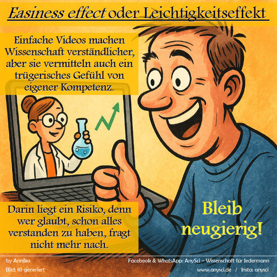 Ein Team der Universität zu Köln hat untersucht, was passiert, wenn die Zusammenfassung wissenschaftlicher Studien (Abstracts) in kurze Videos übersetzt werden – einmal in komplexer Sprache und Darstellung, einmal vereinfacht. Dazu produzierten die Forschenden Videoversionen von vier Studien und zeigten sie 179 Proband:innen. Einige von ihnen erhielten zusätzlich ein erklärendes Video, das sie vorab über den sogenannten „Easiness-Effekt“ aufklärte. Das ist ein Mechanismus, der dazu führt, dass leicht verständliche Inhalte als glaubwürdiger empfunden werden und uns dazu verleiten, unsere eigene Kompetenz zu überschätzen.
